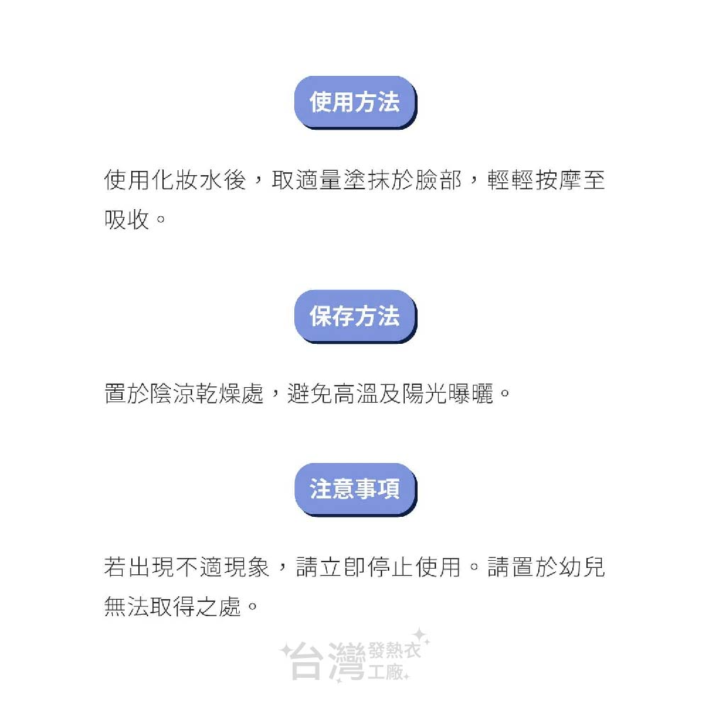 使用化妝水後,取適量塗抹於臉部,輕輕按摩至吸收。