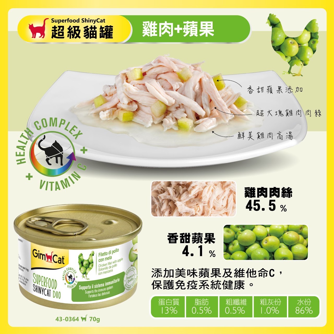 營養分析:蛋白質14.0%,脂肪1.0%,粗纖維1.0%,粗灰分1.0%,水份84.0%