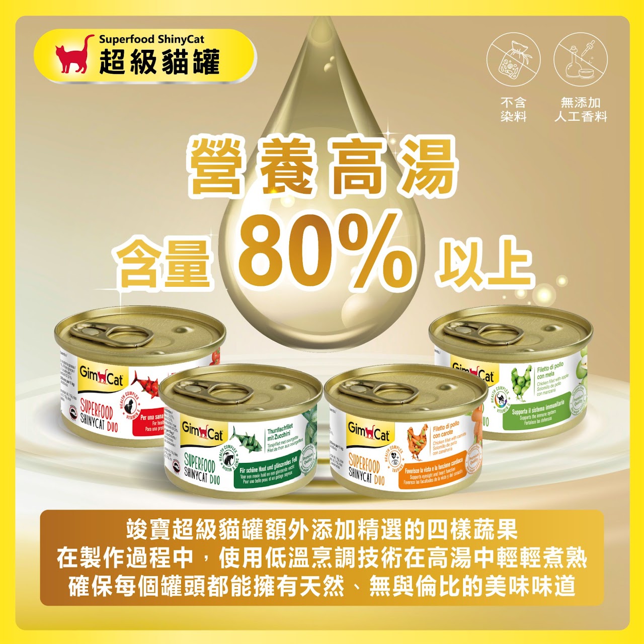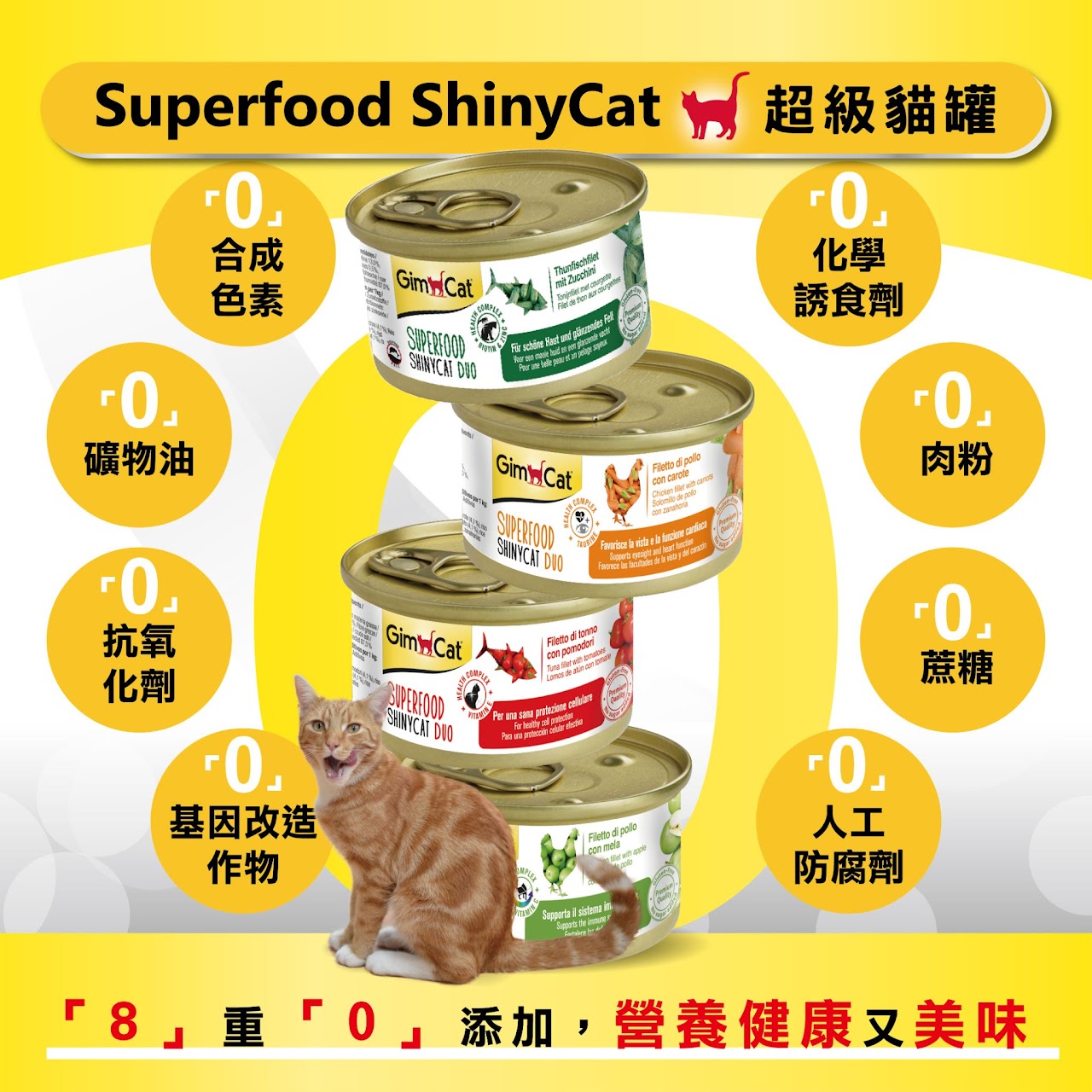 豐富蛋白質的鮪魚製成,提供愛貓最美味及均衡的一餐,使一天的活力充沛。不含防腐劑、不含調味劑、乳糖減少、無添加糖、無色素、無抗氧化劑