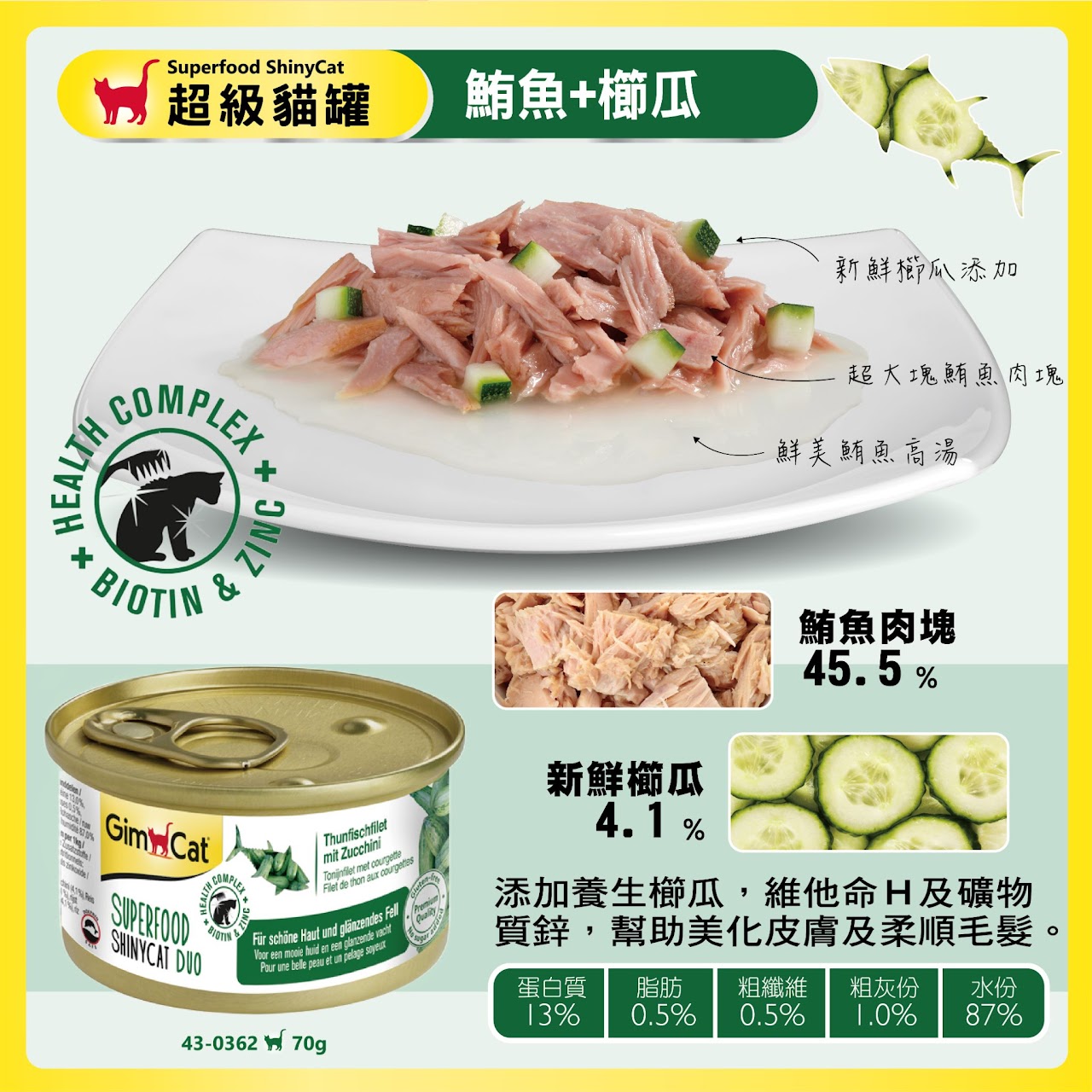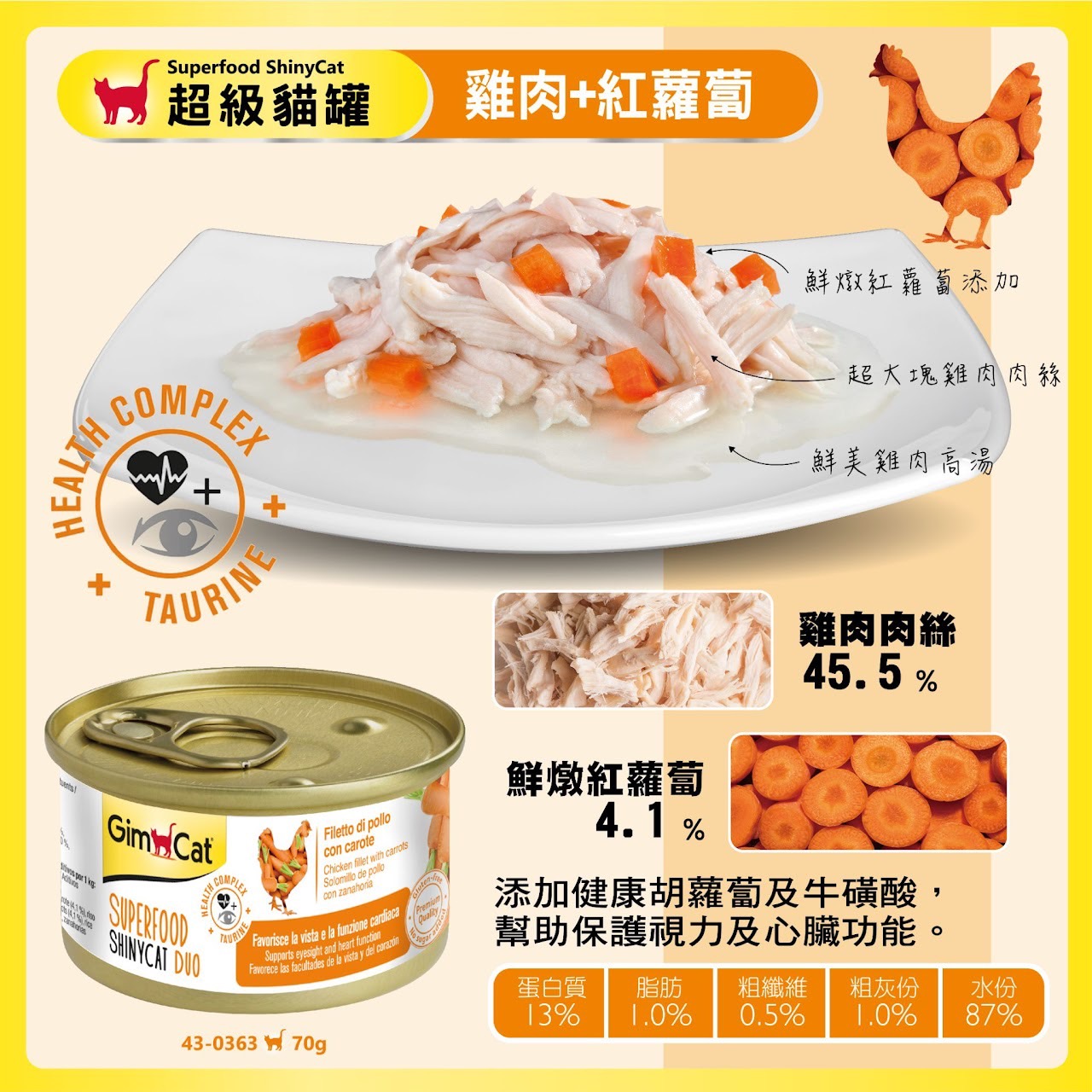 提供豐富的蛋白質、維生素E及牛磺酸,並添加貓草可幫助化毛,使愛貓維持腸胃健康。