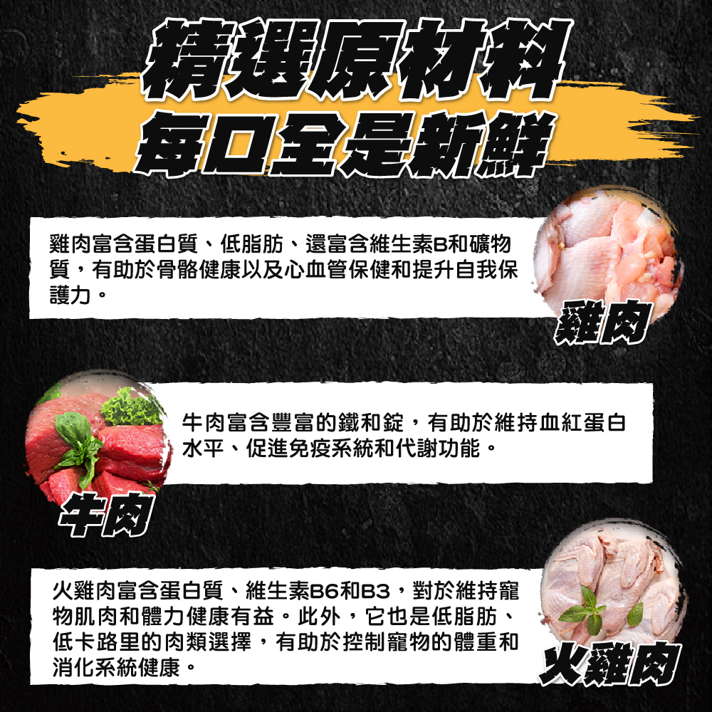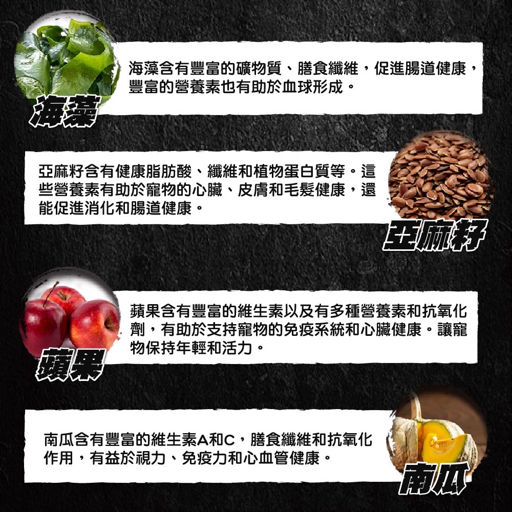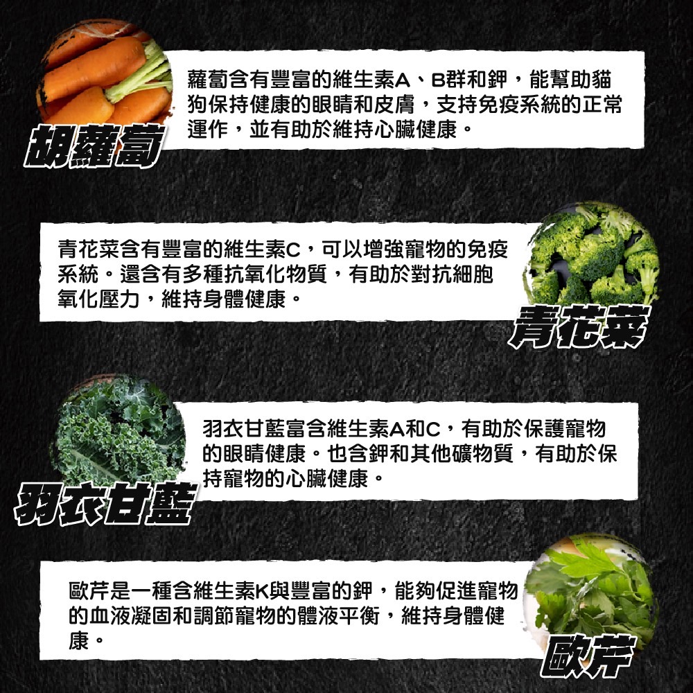 🐱維持理想體態:90%完整肉類營養,加上 10% 蔬菜、水果、超級食物、必須營養素,低碳水高蛋白,讓貓狗不因攝取過多澱粉而發胖。