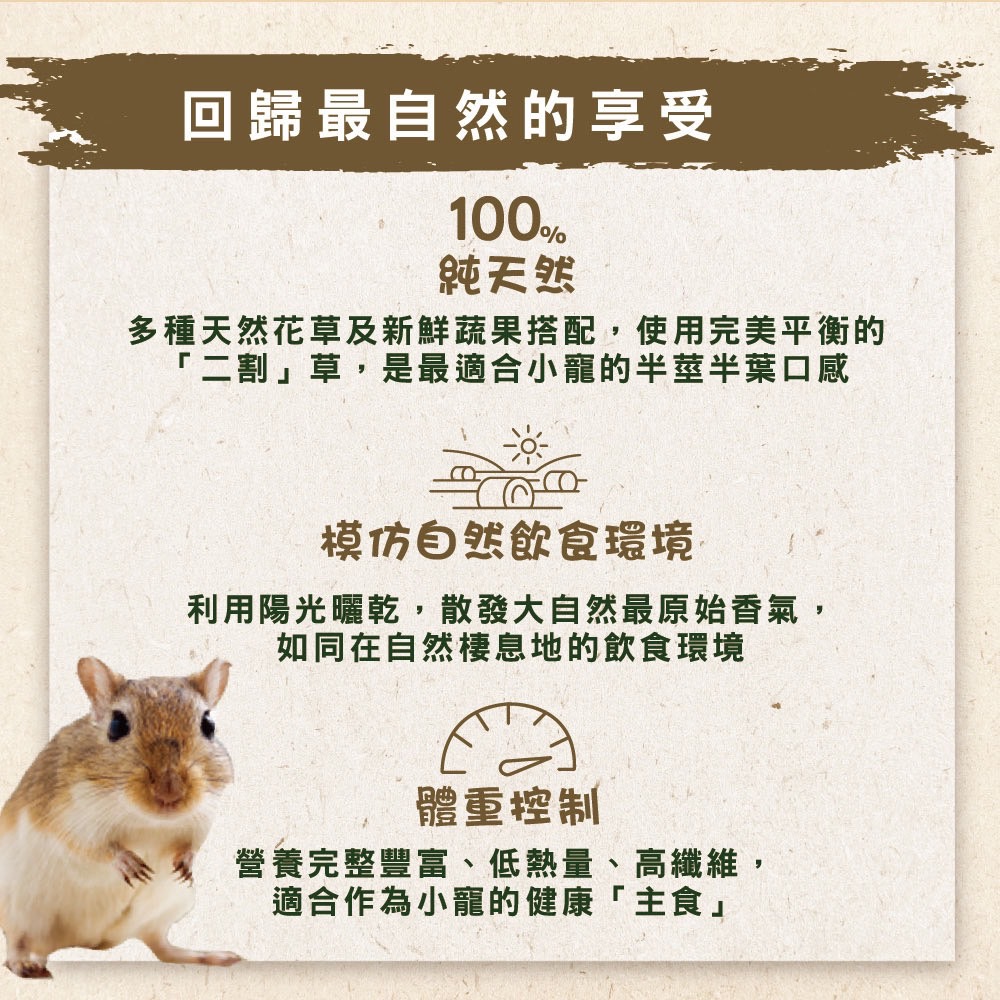 100%純天然德國洋甘菊、乾薄荷和乾草,充滿大自然的精華,陽光曬乾帶有自然香氣,模擬小動物在自然棲息地的飲食環境及感官,使情緒更放鬆,照顧小寵營養健康。