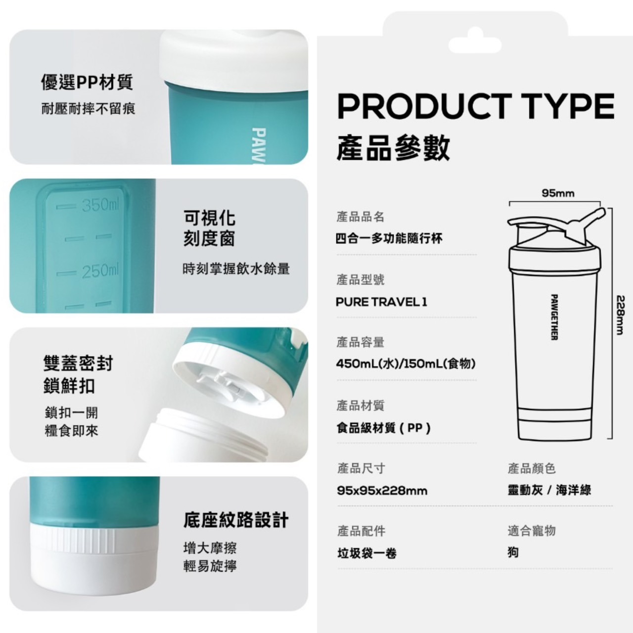 特色:創新設計的四合一隨行杯,儲水格、儲糧倉、拾便袋;餵食碗合而為一;輕量設計,輕鬆遛寵隨心而行;增設子母蓋以及矽膠密封圈,多重密封設計防止灑漏;安全無味的PP食品級材質,戶外也能滿足寵物的健康飲水需求。