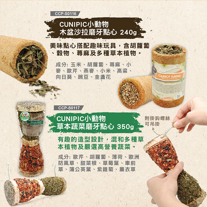 特色:有趣的造型設計,混合多種草本植物及嚴選高營養蔬菜,適合各種小動物啃食,娛樂同時可幫助磨牙,作為小寵的日常零嘴及營養補充品。