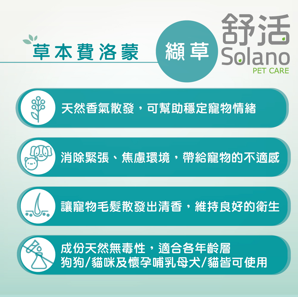 特色:直接配戴於寵物身上,天然草本費洛蒙成分,可有效減少寵物緊張行為及安撫憂鬱情緒,效果長達8週。