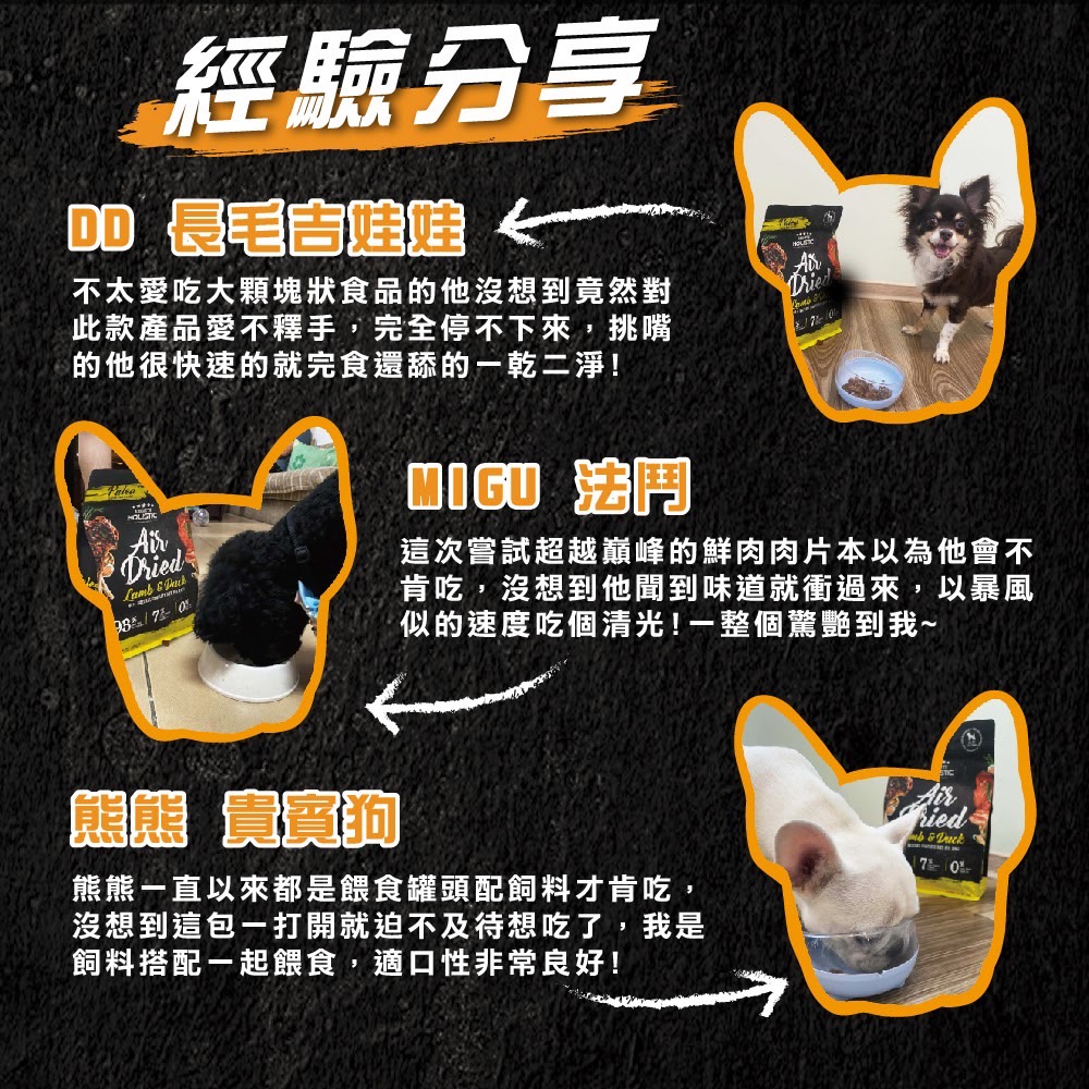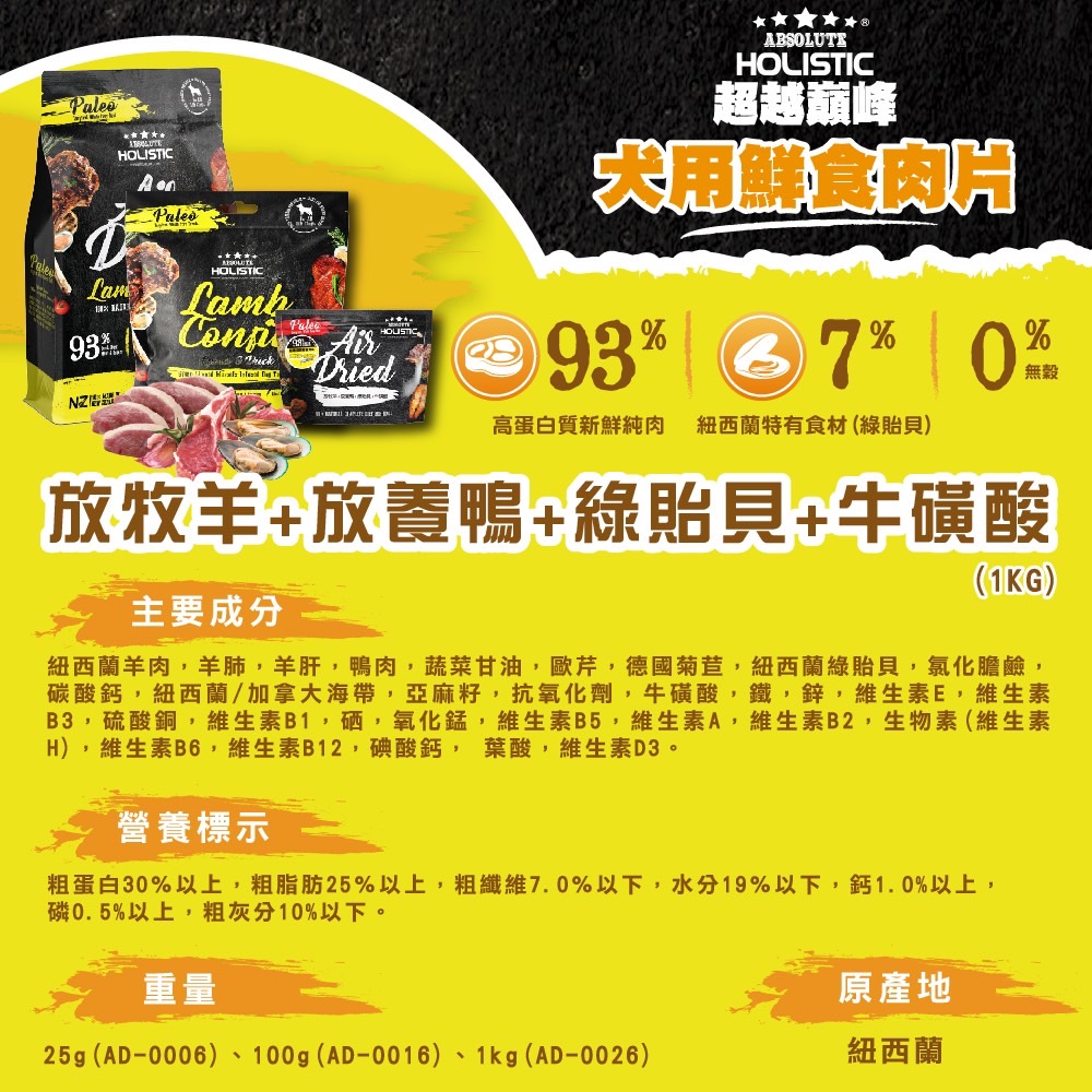 ● 成份 :紐西蘭羊肉,羊肺,羊肝,鴨肉,蔬菜甘油,歐芹,德國菊苣,紐西蘭綠貽貝,氯化膽鹼,碳酸鈣,紐西蘭/加拿大海帶,亞麻籽,抗氧化劑,牛磺酸,鐵,鋅,維生素E,維生素B3,硫酸銅,維生素B1,硒,氧化錳,維生素B5, 維生素A,維生素B2,生物素 (維生素H),維生素B6,維生素B12,碘酸鈣, 葉酸,維生素D3。