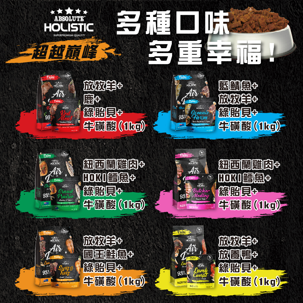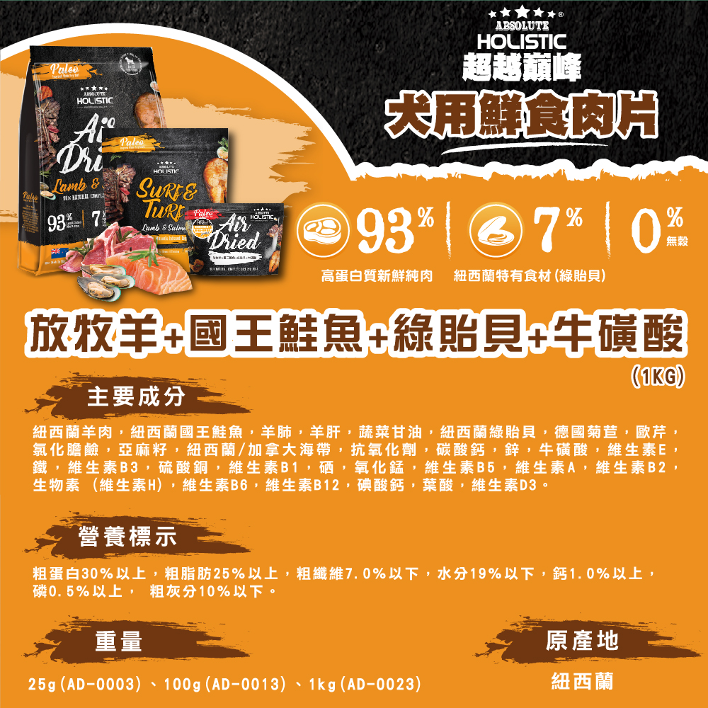 ● 成份 :紐西蘭羊肉,紐西蘭國王鮭魚,羊肺,羊肝,蔬菜甘油,紐西蘭綠貽貝, 德國菊苣,歐芹,氯化膽鹼,亞麻籽,紐西蘭/加拿大海帶,抗氧化劑, 碳酸鈣,鋅,牛磺酸,維生素E,鐵,維生素B3,硫酸銅,維生素B1,硒, 氧化錳,維生素B5,維生素A,維生素B2,生物素 (維生素H),維生素B6,維生素B12,碘酸鈣,葉酸,維生素D3。