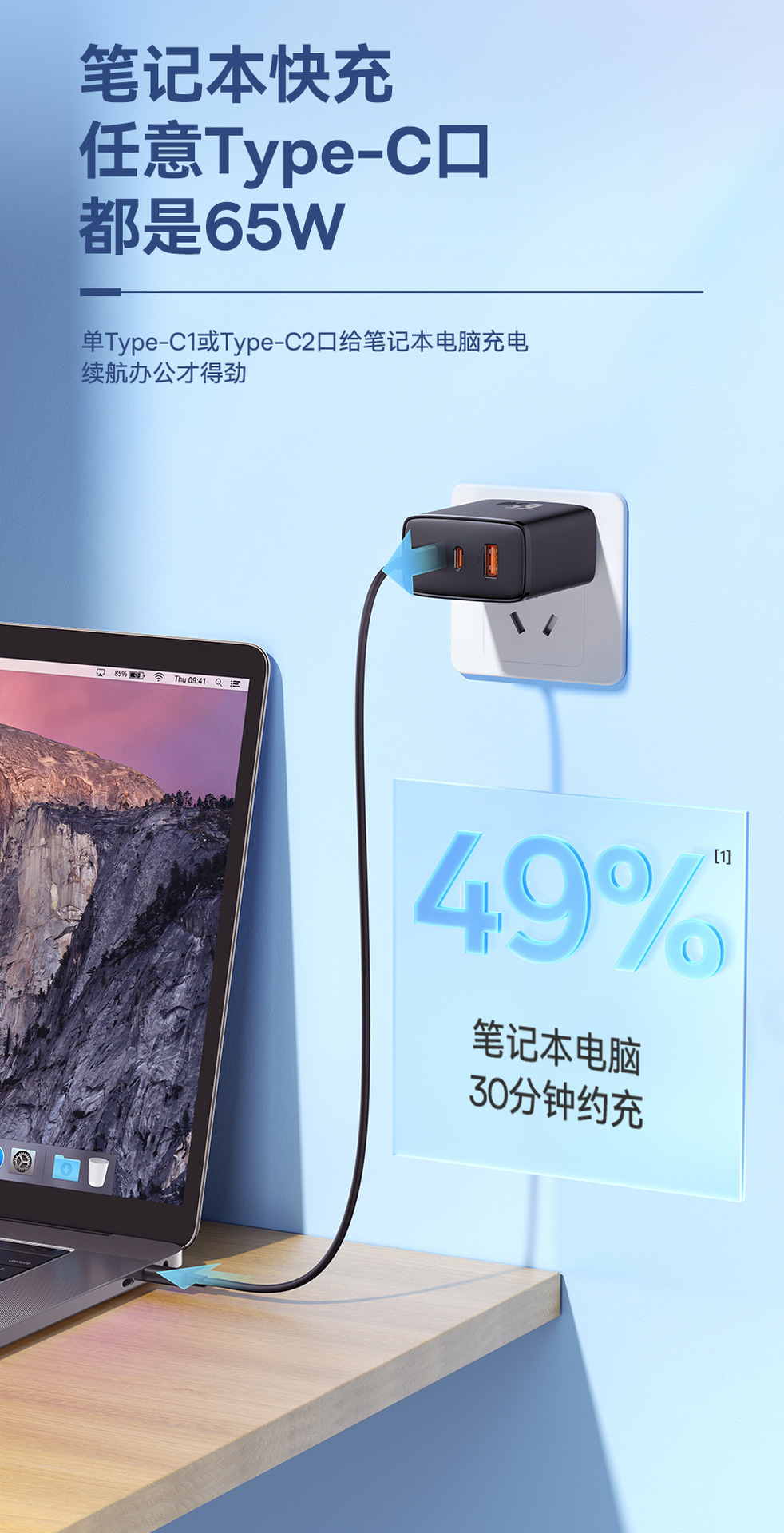 雙口輸出: TC1+USB=65W+5W or 65W+15W
