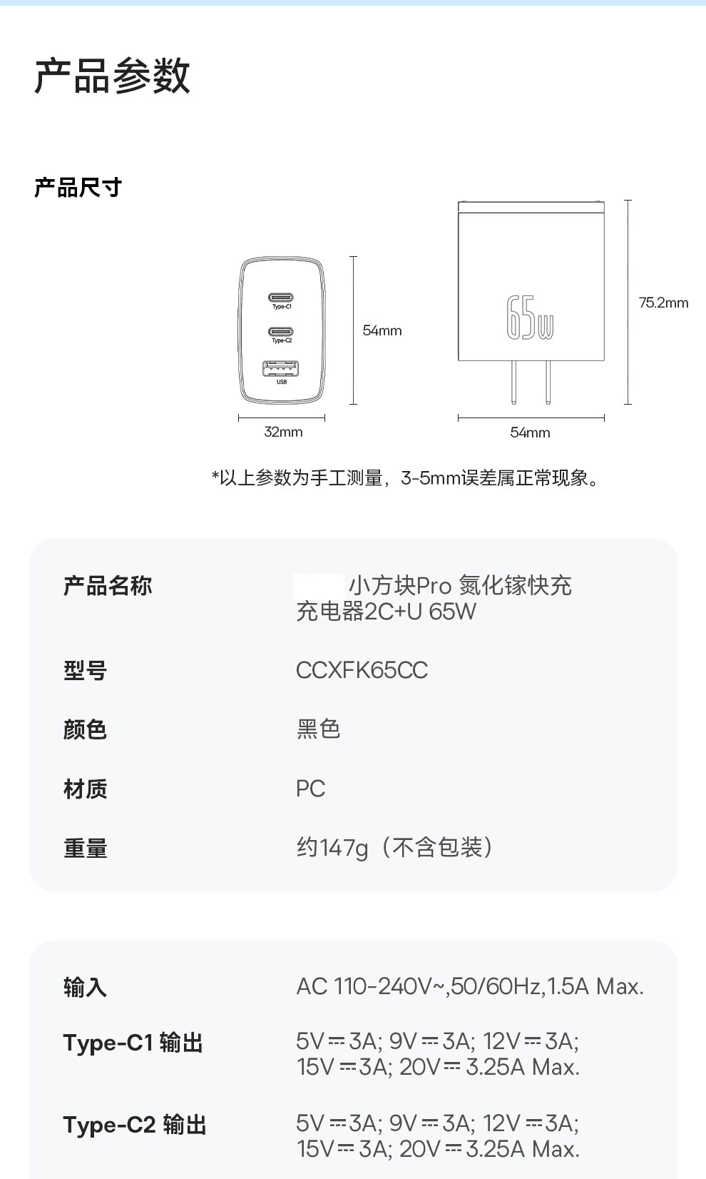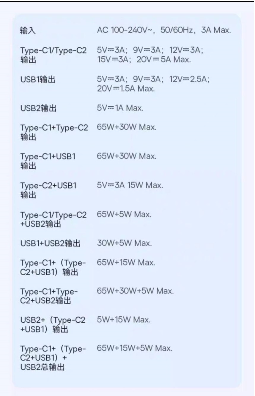 Type-C1輸出:5V/3A 9V/3A 12V/3A 15V/3A 20V/3.25A