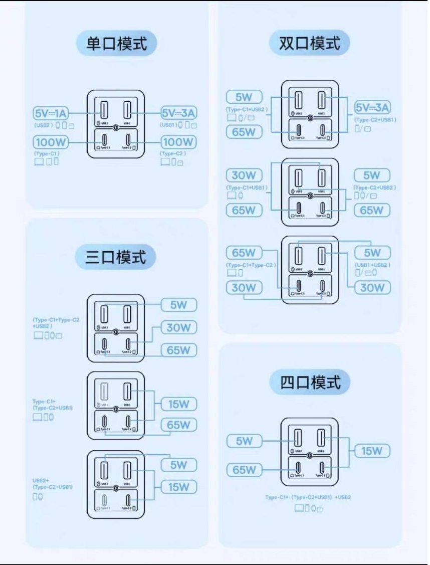 TC1+TC2+USB1+USB2=65W+15W+15W+5W
