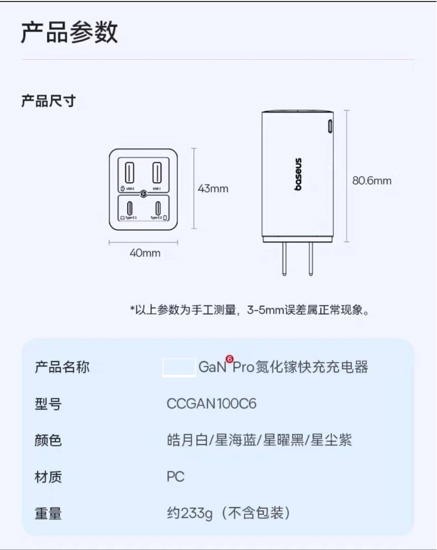 名稱: Baseus倍思 100W氮化鎵Gan Pro 6 充電器