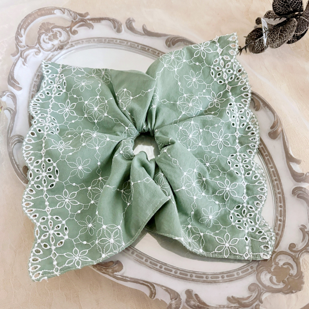 *哈娜髮飾*方形大腸圈/ 髮圈 刺繡蕾絲 綠色腸圈 棉布大腸髮圈 髮束 髮繩 髮飾 頭飾 禮物