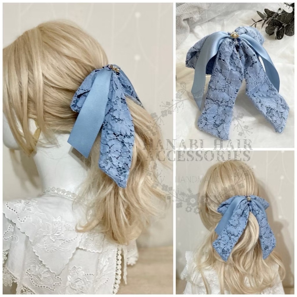 *哈娜髮飾*法式絲巾式仙女夾 霧藍蕾絲 香蕉夾 髮圈 馬尾夾 髮夾 相交夾 三爪夾 包頭抓夾 鯊魚夾 髮叉 髮梳 邊夾