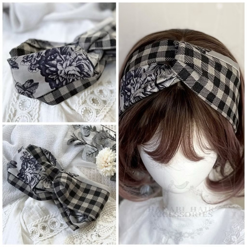 *哈娜髮飾*交叉髮帶 黑格子 寬版 頭巾 頭飾 頭帶 鬆緊帶髮帶~