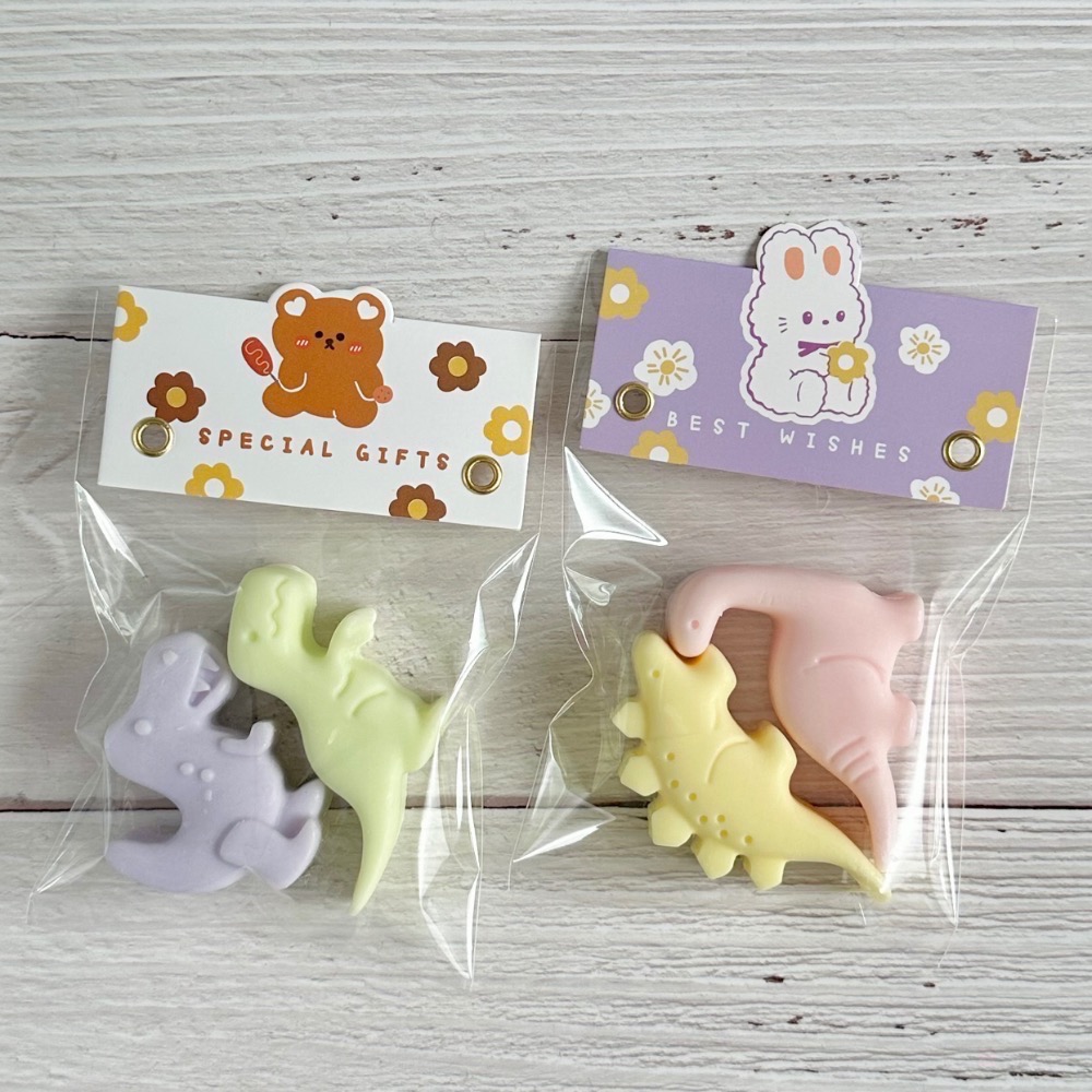 🦖恐龍肥皂1入組以透明自黏袋包裝(小朋友也可以再自行加工貼貼紙喔),2入組以可愛的夾鍊袋或OPP袋加卡頭包裝(袋面、卡頭圖案隨機;夾鏈袋可以重覆利用喔)。