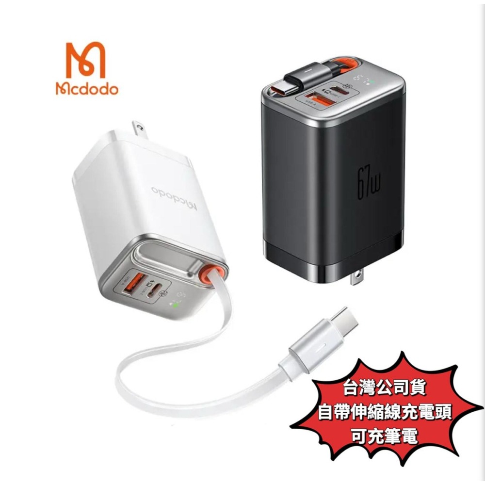 🌟現在!一顆自帶線的充電頭就能搞定麥多多最新款67W 自帶伸縮充電線二孔充電器使用氨化鎵技術,讓體積更小充電效率更好小巧輕便好攜帶!折疊插腳更方便 67W高功率,手機筆電通通都能充 每支手機充電協議不同,不一定每一支都能達到67w 最高功率