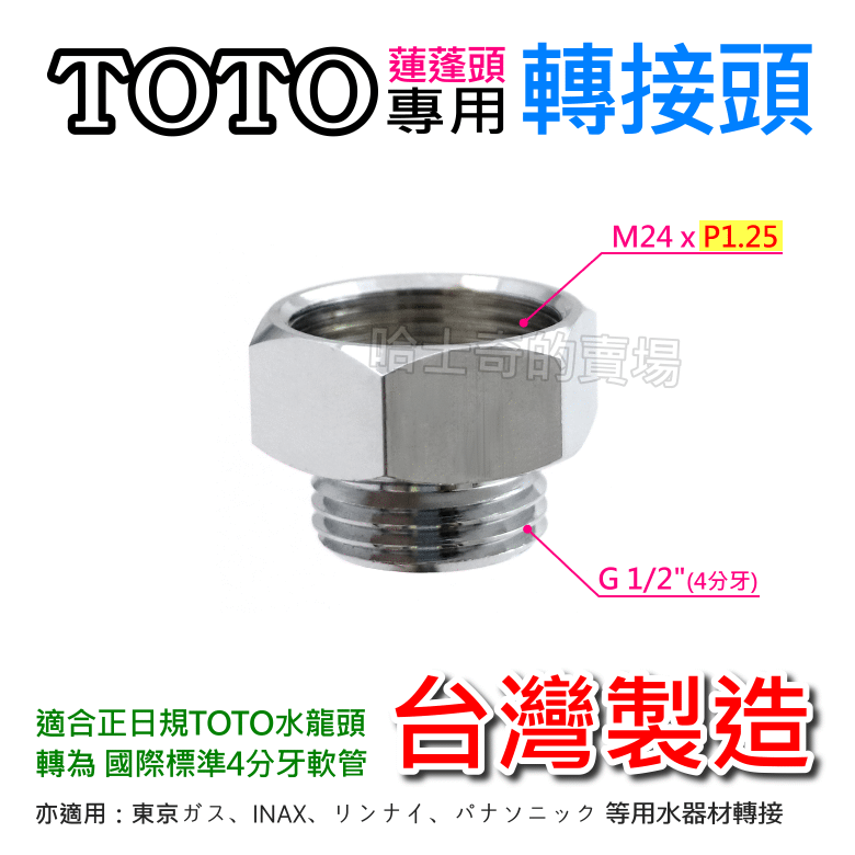 本品用於將日規TOTO的水龍頭或蓮蓬頭,轉接成可銜接國際標準的4分沐浴軟管,以更符大眾化普及使用