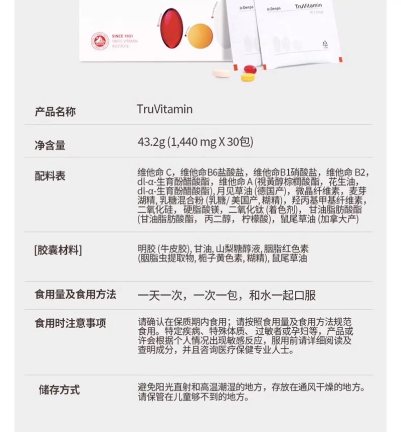 原料名稱及含量:維生素C、維生素B6鹽酸鹽、維生素B1硝酸鹽、維生素B2、DL-α-生育醇、維生素A混合製劑(維生素A棕櫚酸酯、花生油、DL-α-生育酚)、維生素D3油{維生素D3、加工油(棕櫚油) ))、DL-α-生育醇}、葡萄籽油、結晶纖維素、麥芽糊精、乳糖混合粉(乳糖、糊精)、羥丙基甲基纖維素、二氧化矽、硬脂酸鎂、碳酸鈣混合製劑(碳酸鈣、改性澱粉)、甘油脂肪酸酯,鼠尾草油[膠囊基質]明膠,甘油,D-山梨糖醇溶液,紅色混合製劑{混合製劑(糊精,胭脂紅),梔子黃色素,糊精},鼠尾草油[含有牛奶,花生,牛肉]