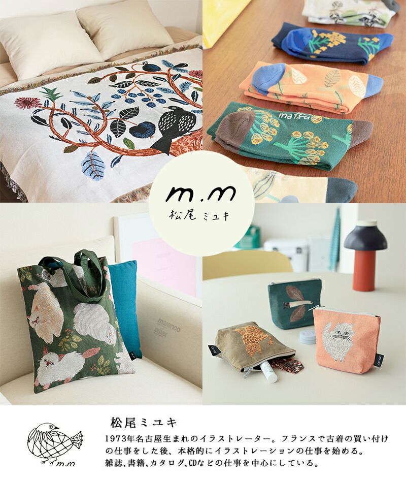 松尾美雪 Matsuo Miyuki 松尾ミユキ,1973年出生於日本名古屋,曾在法國從事古著採購工作,而後正式的成為一名自由職業插畫家。 主要以書籍、雜誌、目錄、CD封面、包裝、食器、織物等為中心進行插畫創作。筆下的動物不走可愛軟萌路線,反而帶有古靈精怪、神秘莫測的氣息,手繪線條帶有親切感,是充滿個性的風格單品!