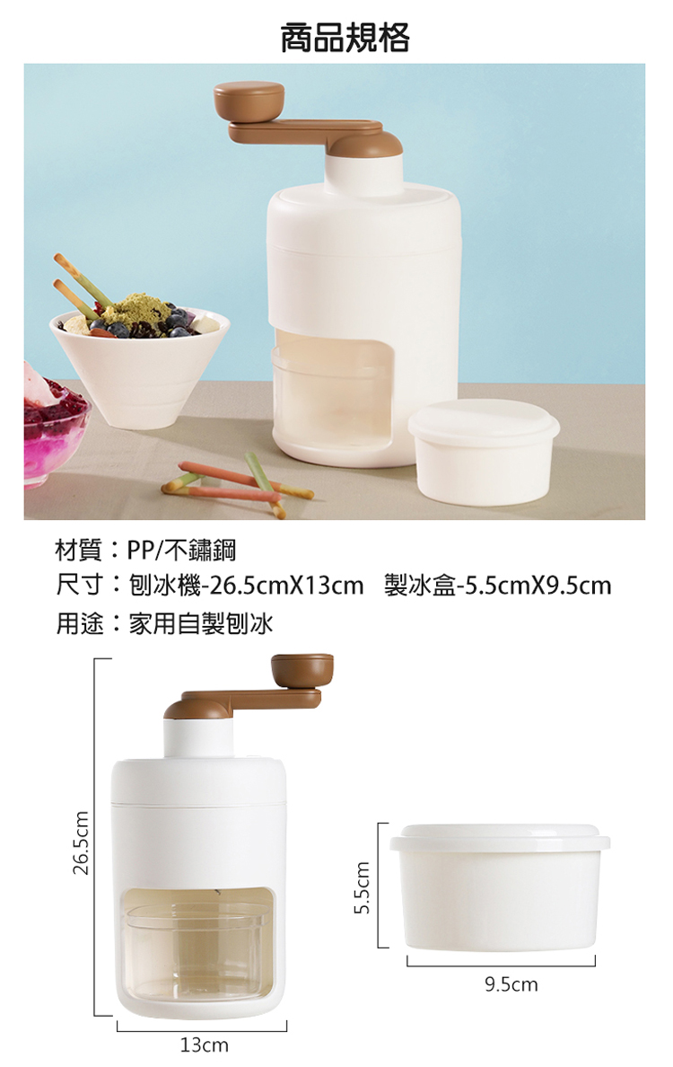 規格:刨冰機:26.5cmX13cm±5% / 製冰盒:5.5cmX9.5cm±5%