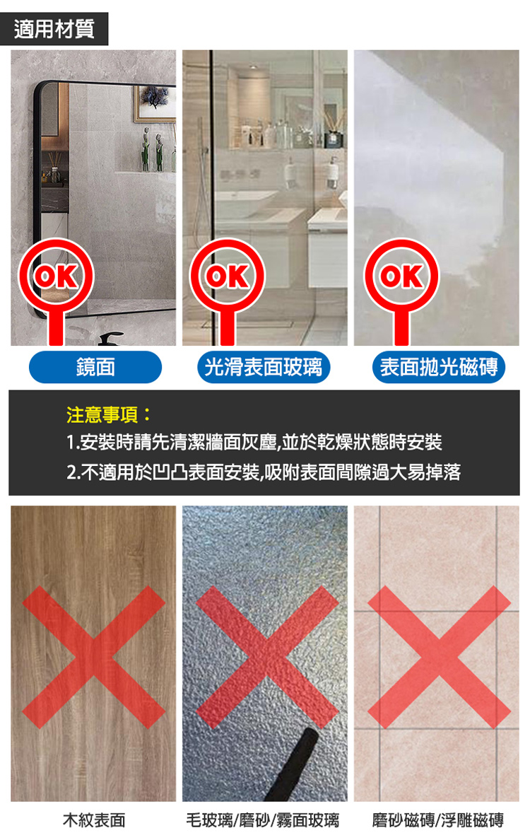 注意事項:安裝時請務必在玻璃、磁磚等光滑面使用,且需清潔灰塵表面後在安裝。