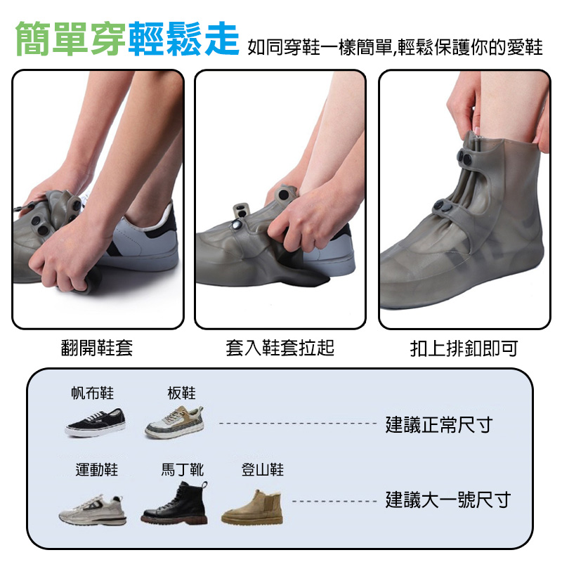 尺寸:M、L、XL、2XL、3XL (穿著的鞋款會影響鞋套適合的鞋碼,請參考網頁尺寸參考圖)