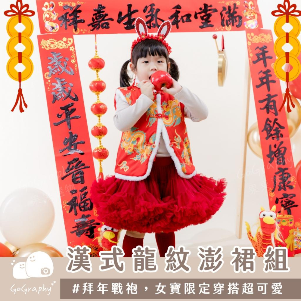 抓周 新年 過年 龍年 抓周拜年戰袍 新年戰袍 春節服裝 過年穿搭 漢服 春節 女寶 澎裙 洋裝 背心|GoGraphy