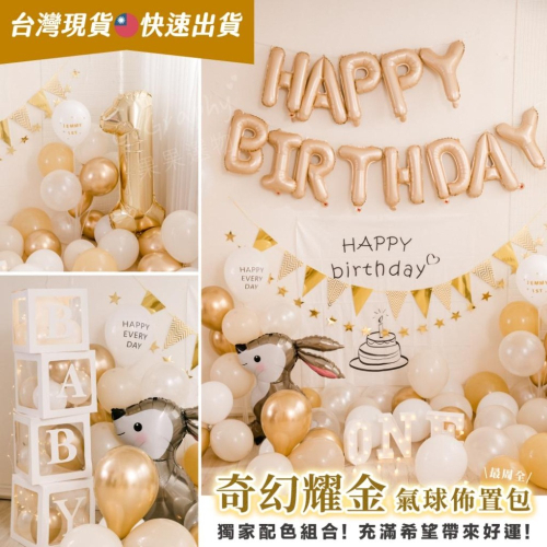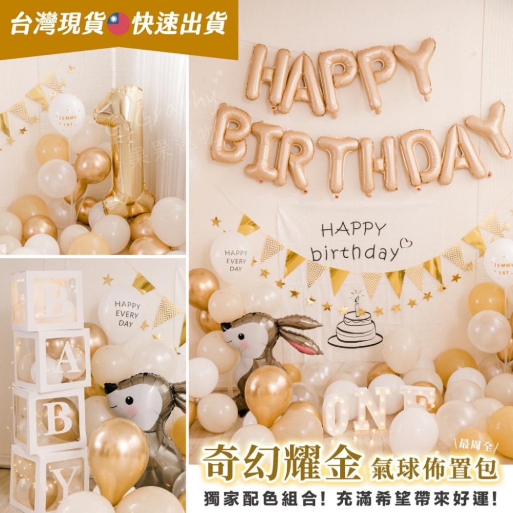 ✻奇幻耀金精緻A組(ONE-LED燈座/暖白圓球燈/銅線燈/HBD掛布/BABY氣球盒組/假空飄氣球合組/七顆氣球組/四顆氣球組/34柯落地裝飾氣球/白金數字氣球組/生肖鋁膜氣球/金色紙三角旗/金色星星串/焦糖色HBD鋁膜氣球/金蔥貼紙組)