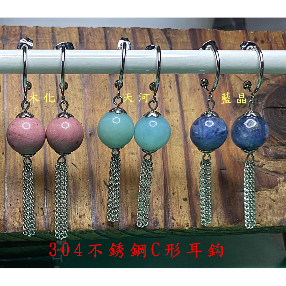 ◆情牽水晶時刻舒心◆防過敏304不銹鋼C型耳鈎佐天然藍晶石木化石天河石12MM+流蘇垂墜耳環