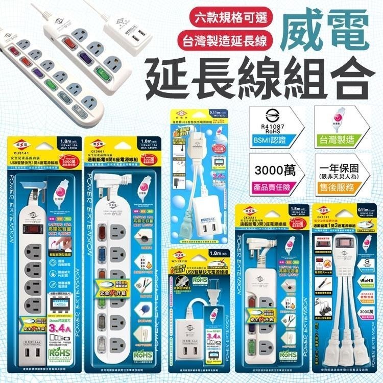 【商品特色】 🔥好用的延長線在這裡🔥 ⭕️2019新安規 BSMI:R41087 ⭕️防火、耐衝擊材料 ⭕️過載自動斷電裝置 ⭕️一體成形導電銅片,堅固不鬆懈 ⚠️請勿將電源線捆綁使用,以避免不易散熱,造成電源線融化短路發生火災危險 ⚠️請勿將電源線任意扭曲、用力拉扯,導致破損發生危險 ⚠️請勿在溼氣多及會有水濺出的地方使用,以免觸電危險,發生火災 ⚠️請勿用尖銳物品碰觸電源線,以避免電源線破損發熱造成觸電 ⚠️請勿用潮濕的手,觸摸插頭、插座或電線,以避免觸電危險 ⚠️請勿用重物擠壓電源線,以避免電源線破損發熱,引起火災 【商品規格】 名稱:台灣製造延長線 材質:銅、阻燃防火PC料 內容:一入 保固:保固為1年非人為損壞可免費維修 款式: 📍威電 6開3孔6插 電腦延長線-180公分 📍威電 3開3孔3插 電腦延長線-180公分 📍威電 雙USB輸出 USB(3.4A快充) 電腦延長線-180公分 📍威電 1開3孔4插+雙USB輸出(3.4A快充) 電腦延長線-180公分 📍威電 旅行雙USB+1插座-(短款) 線長約11公分 📍威電 旅行三插座-(短款) 線長約11公分 產地:台灣 是否需要組裝:否