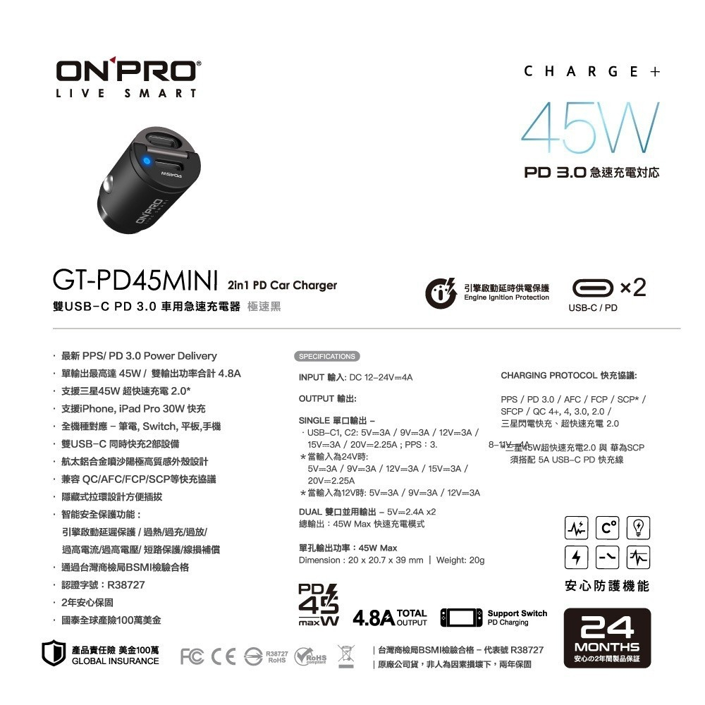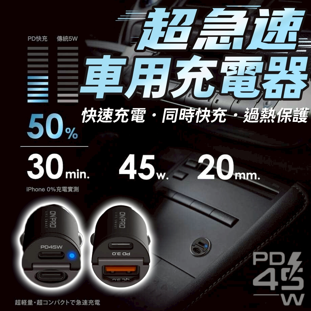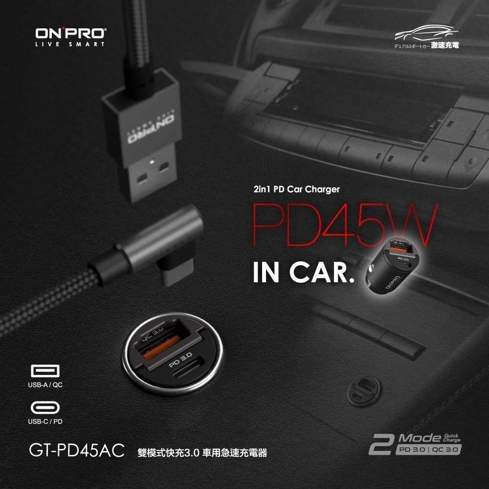 《商品名稱》:GT-PD45AC 雙模式快充 PD+QC3.0 45W超急速車用充電器