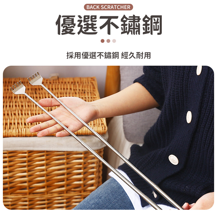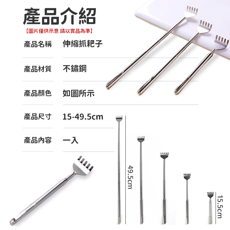 【商品特色】 🔥小孩子還要講說背癢嗎?📍給他一隻讓他一次抓個夠🔥 ⭕️握把伸縮自如,擴大抓癢範圍,一下解決抓不到的問題 ⭕️縮小之後,可隨身攜帶,不占空間 ⭕️圓滑抓齒設計,解癢給力,不傷皮膚 ⭕️選用優質不鏽鋼,結實耐用,使用壽命長 【商品規格】 名稱:伸縮抓耙子 材質:不鏽鋼 內容:一入 規格15-49.5cm 產地:中國 是否需要組裝:否