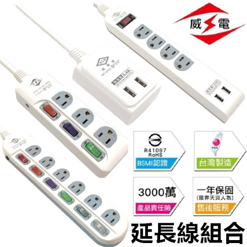 【商品特色】 🔥好用的延長線在這裡🔥 ⭕️2019新安規 BSMI:R41087 ⭕️防火、耐衝擊材料 ⭕️過載自動斷電裝置 ⭕️一體成形導電銅片,堅固不鬆懈 ⚠️請勿將電源線捆綁使用,以避免不易散熱,造成電源線融化短路發生火災危險 ⚠️請勿將電源線任意扭曲、用力拉扯,導致破損發生危險 ⚠️請勿在溼氣多及會有水濺出的地方使用,以免觸電危險,發生火災 ⚠️請勿用尖銳物品碰觸電源線,以避免電源線破損發熱造成觸電 ⚠️請勿用潮濕的手,觸摸插頭、插座或電線,以避免觸電危險 ⚠️請勿用重物擠壓電源線,以避免電源線破損發熱,引起火災 【商品規格】 名稱:台灣製造延長線 材質:銅、阻燃防火PC料 內容:一入 保固:保固為1年非人為損壞可免費維修 款式: 📍威電 6開3孔6插 電腦延長線-180公分 📍威電 3開3孔3插 電腦延長線-180公分 📍威電 雙USB輸出 USB(3.4A快充) 電腦延長線-180公分 📍威電 1開3孔4插+雙USB輸出(3.4A快充) 電腦延長線-180公分 📍威電 旅行雙USB+1插座-(短款) 線長約11公分 📍威電 旅行三插座-(短款) 線長約11公分 產地:台灣 是否需要組裝:否