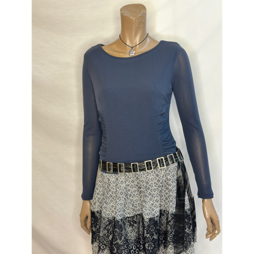 設計款絲襪衣的尺碼為肩寬38公分、胸部42公分、腋下袖寬20公分、袖長59公分、全長61公