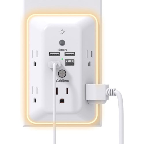 【9合1 USB牆壁插座】您擁有4個USB充電埠(1個USB C)和5個寬間距插座; 3側設計插頭延長器提供更大的空間;插座擴展器邊緣周圍的LED夜燈讓生活更加方便;可拆卸螺絲和塑膠插腳使其牢固地固定在插座上