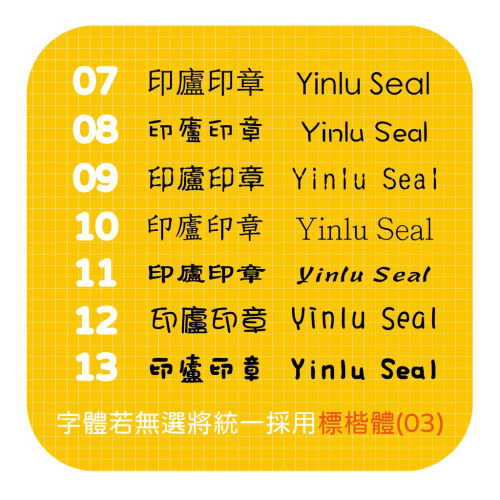 <例如您想選取H款>:H款,印廬印章文創精品館,王小明,字體02(不同區域用逗號分格即可)