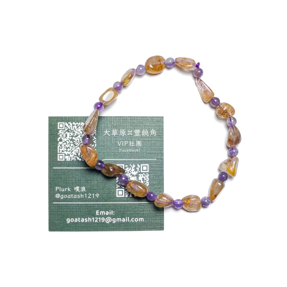 特別挑出特別金的白水晶內含黃磷鐵礦(對,不是紫水晶,至少肉眼看起來沒有紫)跟紫水晶小小珠串在一起。