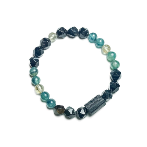 黑碧璽原礦風桶珠、藍綠晶(帶綠色的藍晶石)、藍虎眼(些許有帶黃)鑽切珠、綠碧璽髮晶,帥與美都兼顧到了