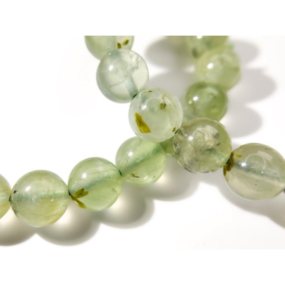 稍有內含物,應該是綠簾石,就我所知葡萄石沒有在搞什麼人工添加內含物或是酸洗灌膠的(或者只是太少所以沒看過樣本?),總之就是看起來有點髒髒的但這正好表示沒有任何加工痕跡,只有磨成珠子而已
