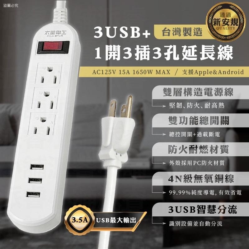 ✔️雙重功能安全開關,是電源總開關,同時也具有過載保護開關之功能(總開關同時控制USB插座)