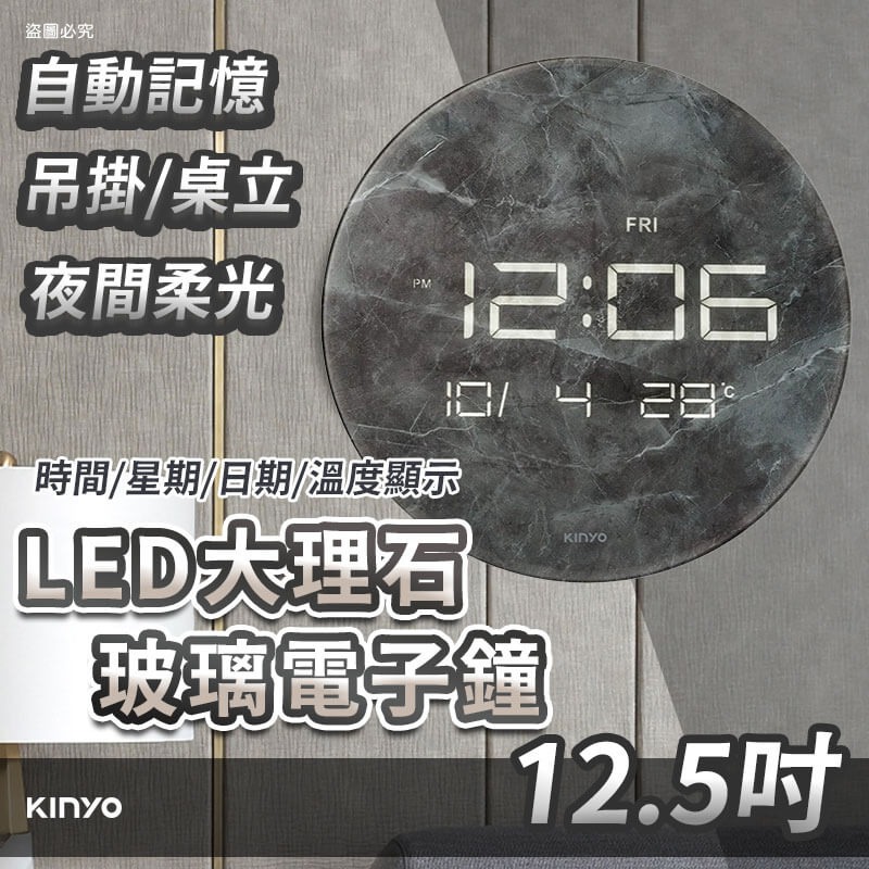 【KINYO LED大理石紋玻璃電子鐘12.5吋】質感 居家 大理石 大螢幕 星期 日期 溫度 可桌立【LD1272】