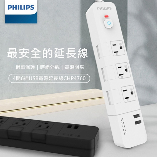 【PHILIPS 飛利浦】1.8M 4切6座+雙USB延長線(CHP4760)白色