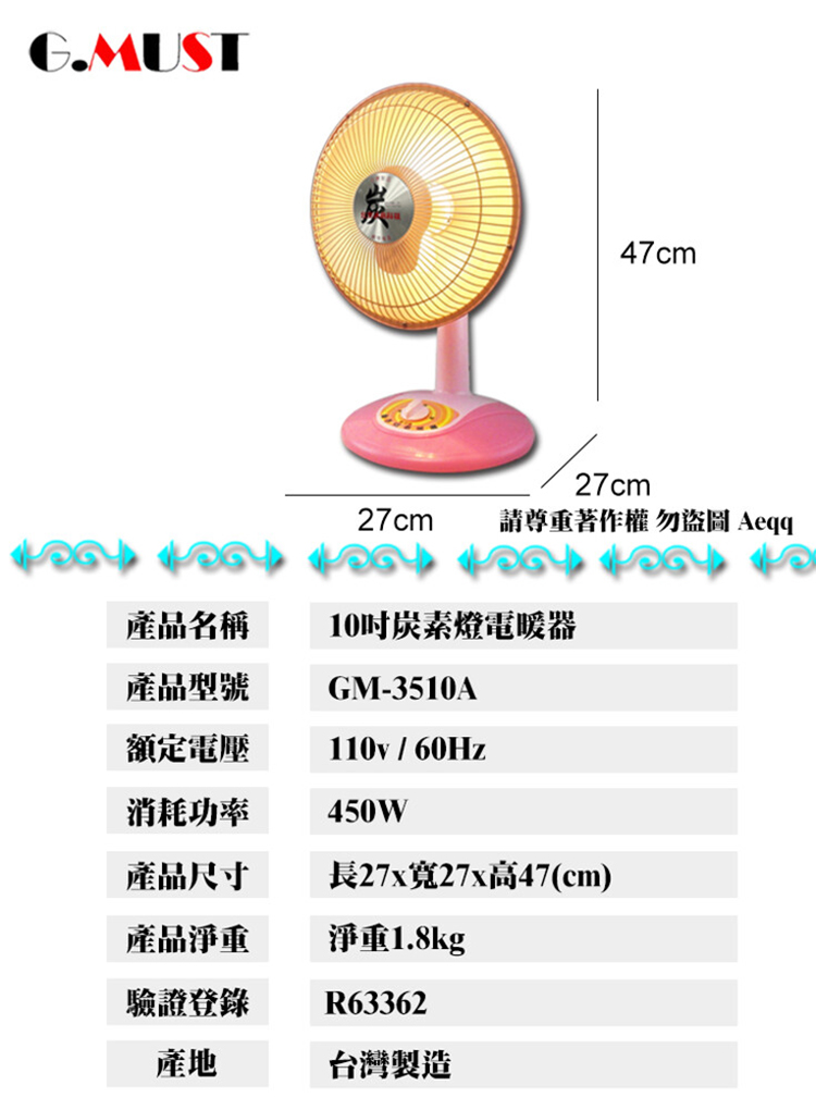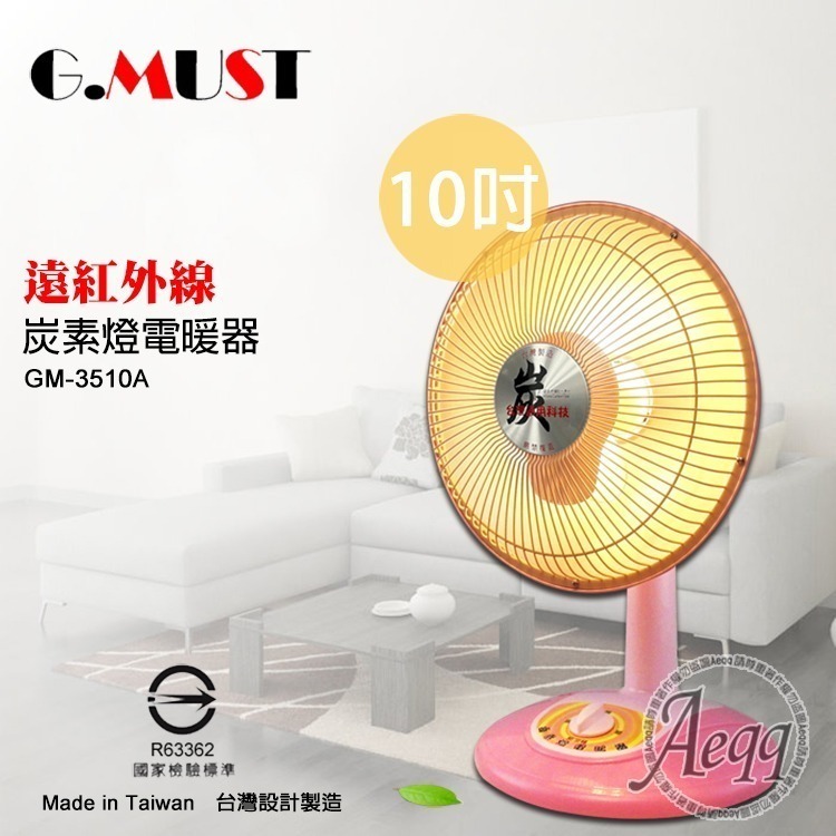 【G.MUST 台灣通用】10吋碳素燈電暖器(GM-3510A)