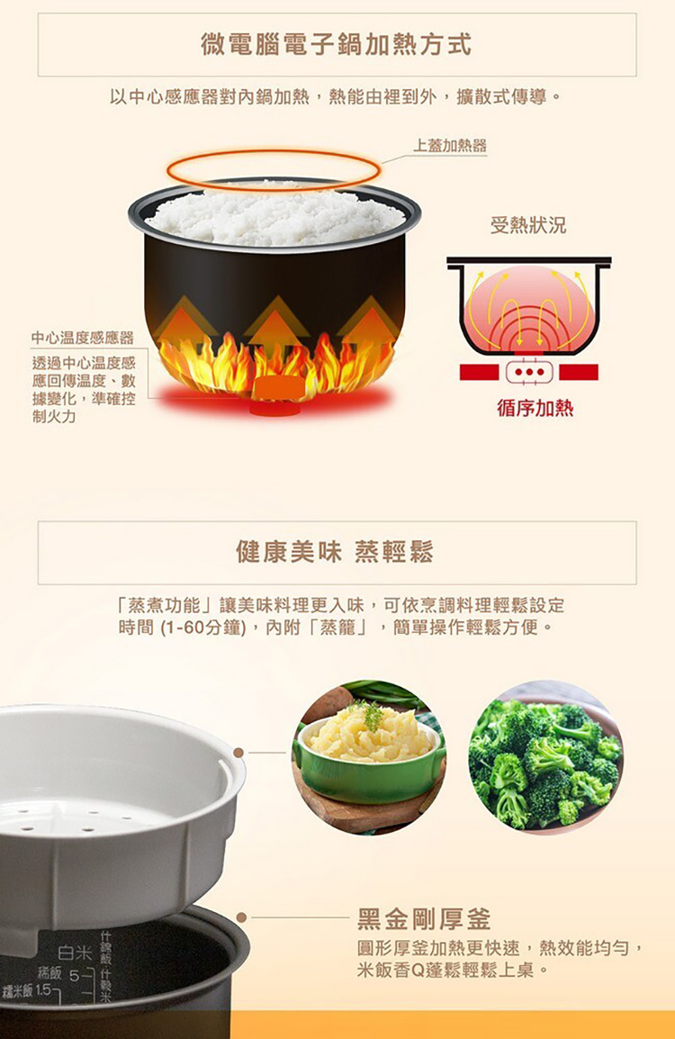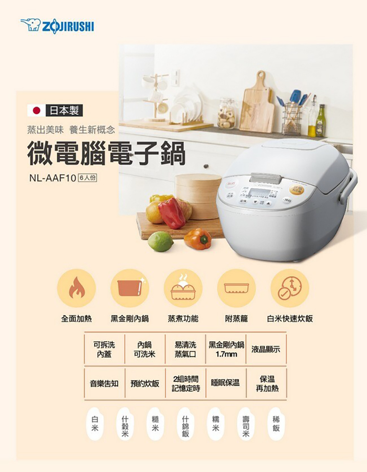 多樣炊煮功能,可炊煮白米、什榖米、糙米、什錦飯、壽司米、糯米飯、稀飯