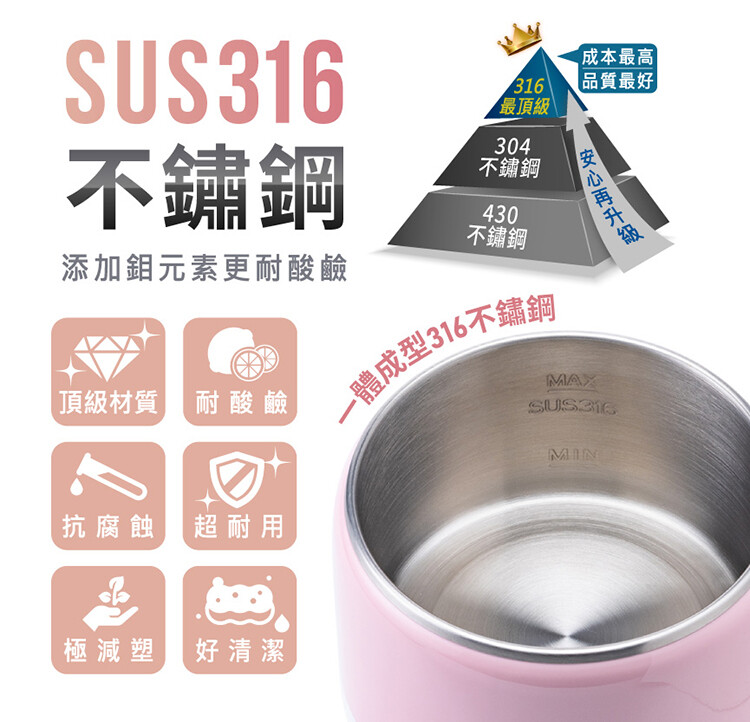 316不鏽鋼內層+中空隔熱層+防燙外層,有效隔熱防燙