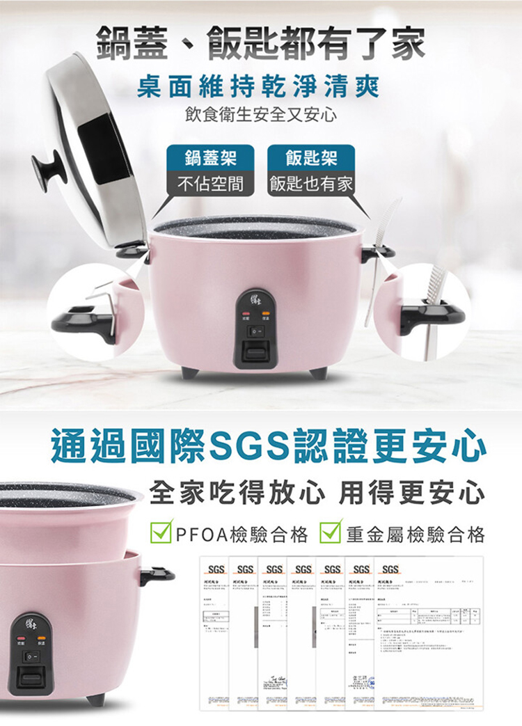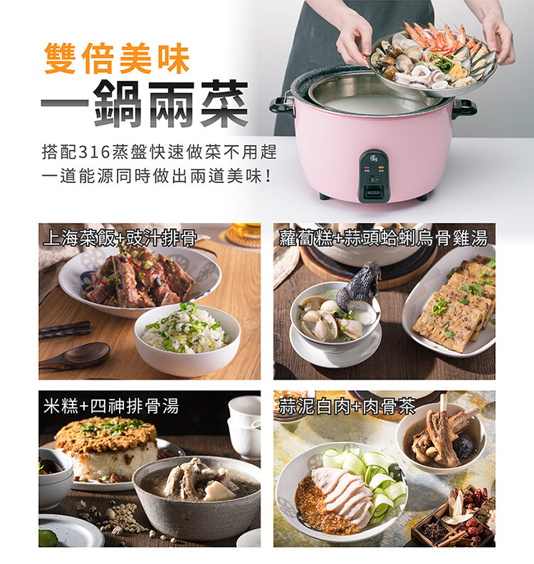 配件:大內鍋x1、小內鍋x1、外鍋x1、蒸架x1、蒸盤x1、飯匙x1、量米杯