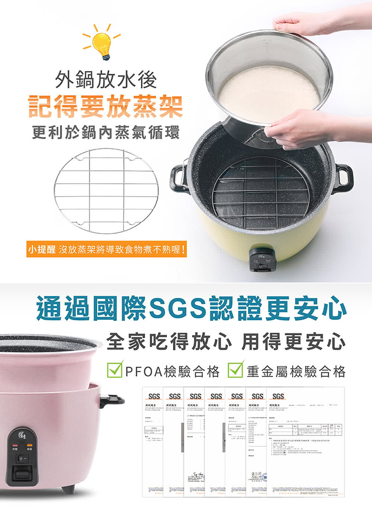 配件:大內鍋x1、小內鍋x1、外鍋x1、蒸架x1、蒸盤x1、飯匙x1、量米杯