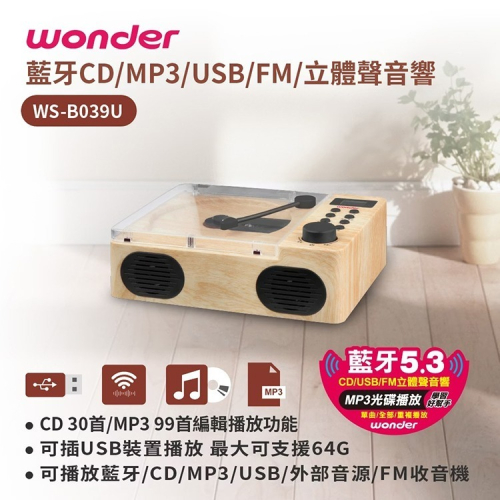 【WONDER 旺德】手提藍牙/CD/MP3/USB/FM立體聲音響(WS-B039U)