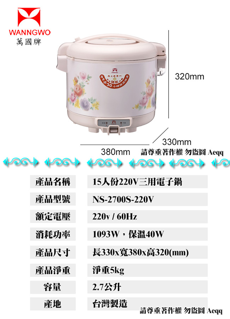 【萬國牌】15人份220V三用電子鍋 (NS-2700S)