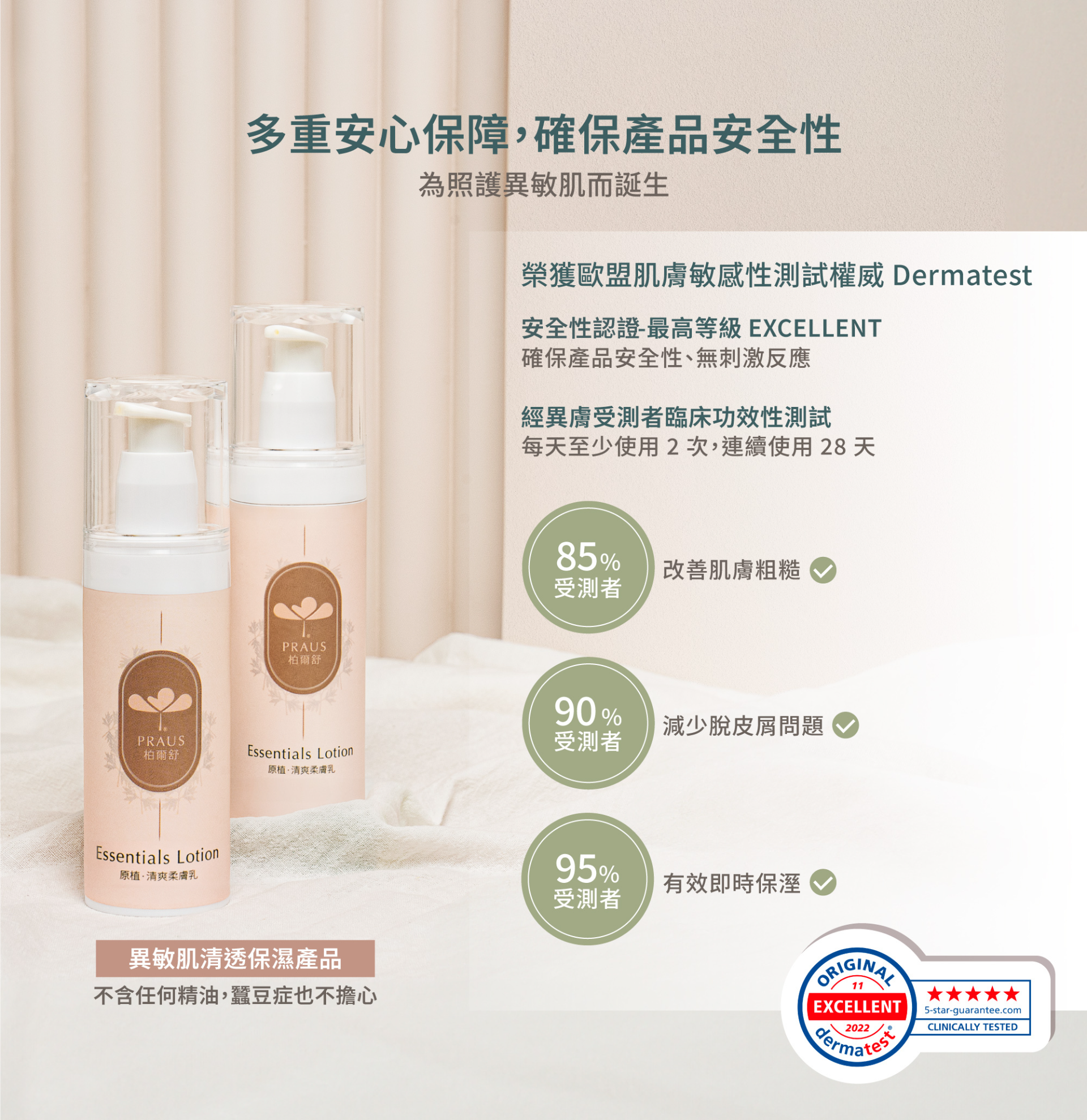 • 異膚受試者人體試驗證實85%改善肌膚粗糙、90%減少脫皮屑問題、95%有效即時保濕